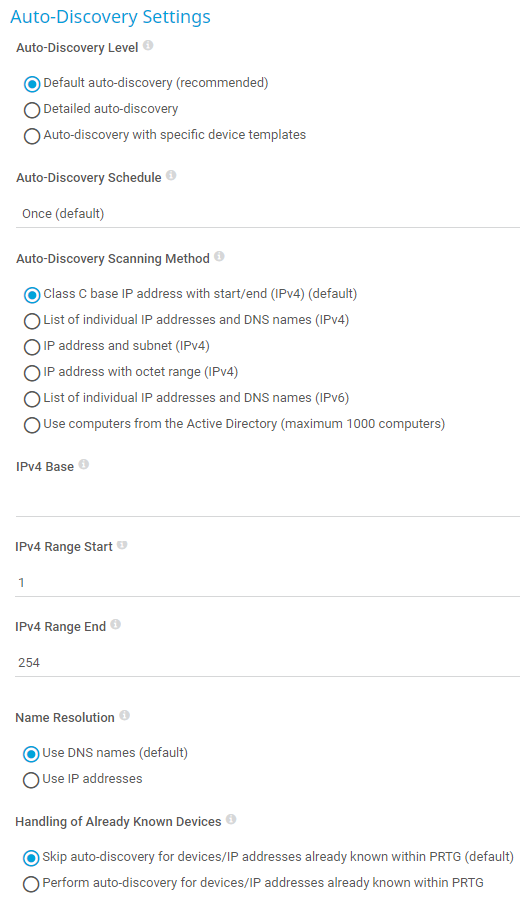 i_round_redUse this option with caution. Frequent auto-discoveries might cause performance issues, in particular when PRTG scans large network segments every hour.