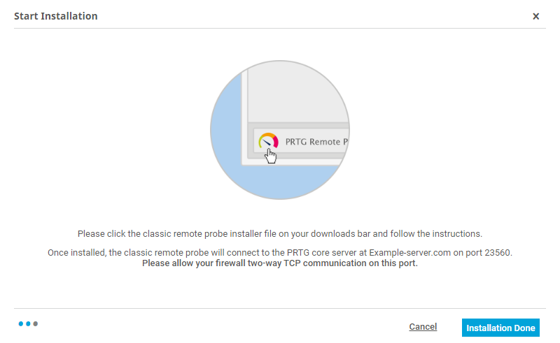 Because remote probes need to connect to your PRTG core server, PRTG needs to accept incoming remote probe connections. So, with PRTG Network Monitor, first prepare your PRTG core server before you install a remote probe.